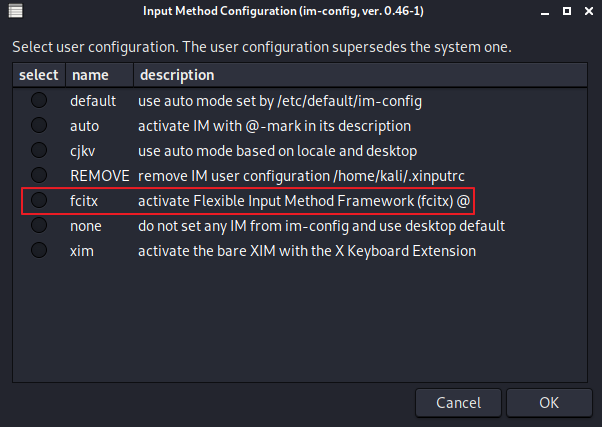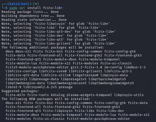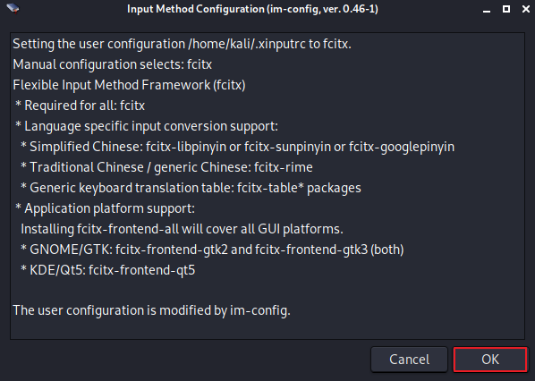 /home/kali/.xinputrc 파일을 fcitx로 지정해서, 앞으로 fcitx 입력기를 쓰도록 설정 했고 필요한 패키지는 어떤거다~ 라는 내용입니다.