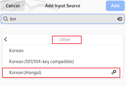 [Keyboard -> Add Input Source -> Other -> Korean ( Hangul )]