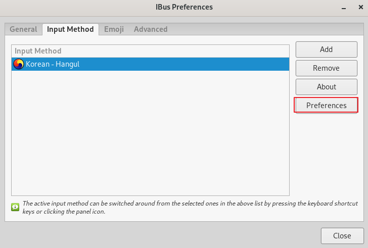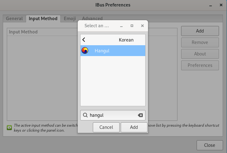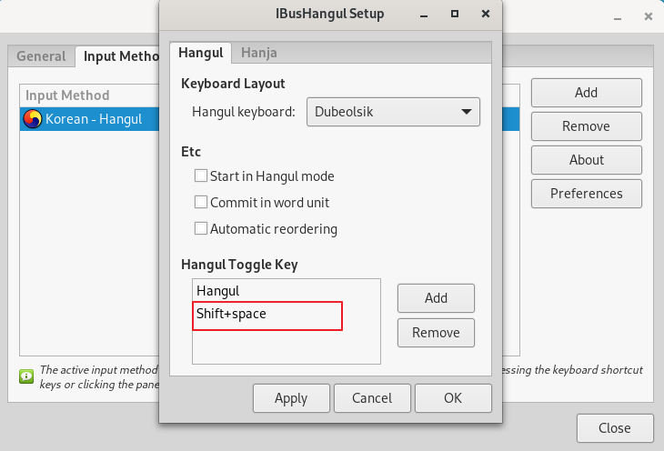 sudo apt install ibus ibus-hangul fonts-nanum -yIBus Preferences 실행