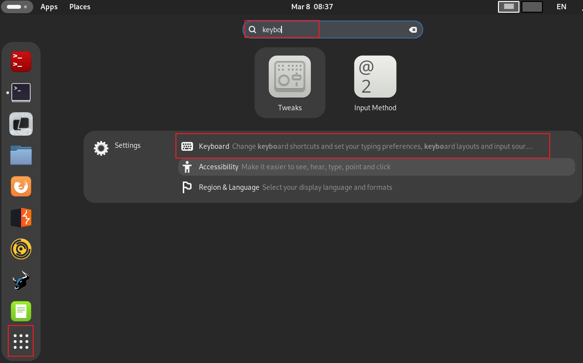 입력기 설정 진행 - 윈도우 키 또는 칼리 리눅스 선택 후 input method 검색 ( 메뉴버튼인 Show Apps 눌러도 됩니다. )